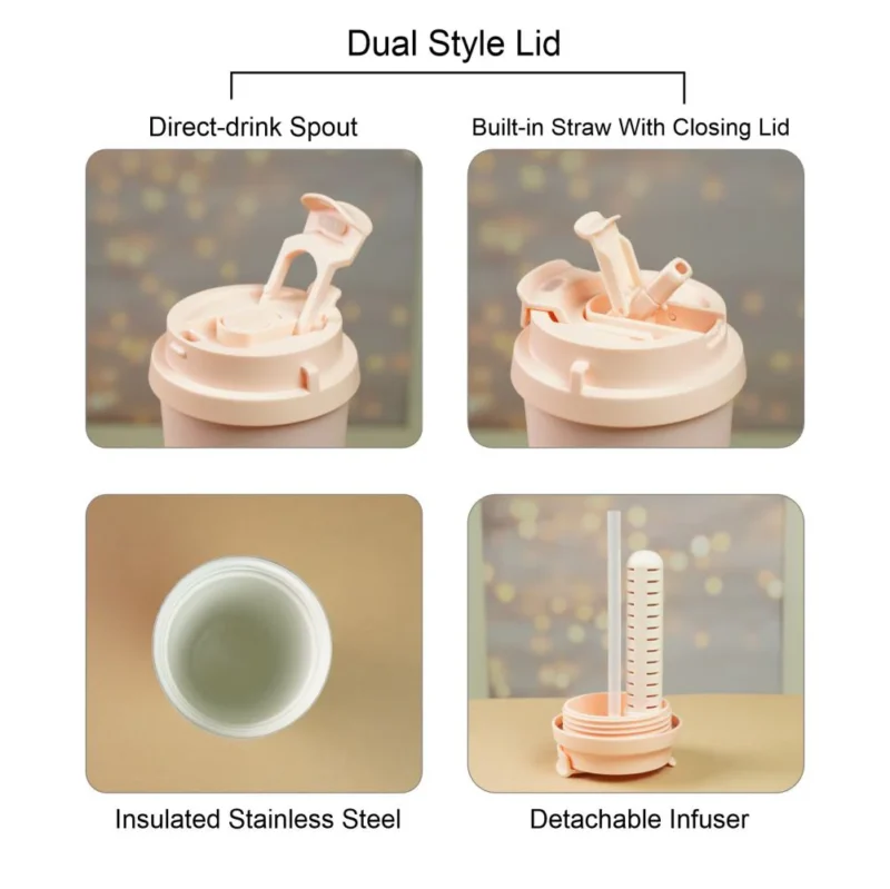 2. Built in detachable Infuser attachment: Featuring a built-in infuser, it allows you to brew loose tea, infuse fruit flavors, or enjoy your favorite beverages on the go while keeping them at the perfect temperature for hours.