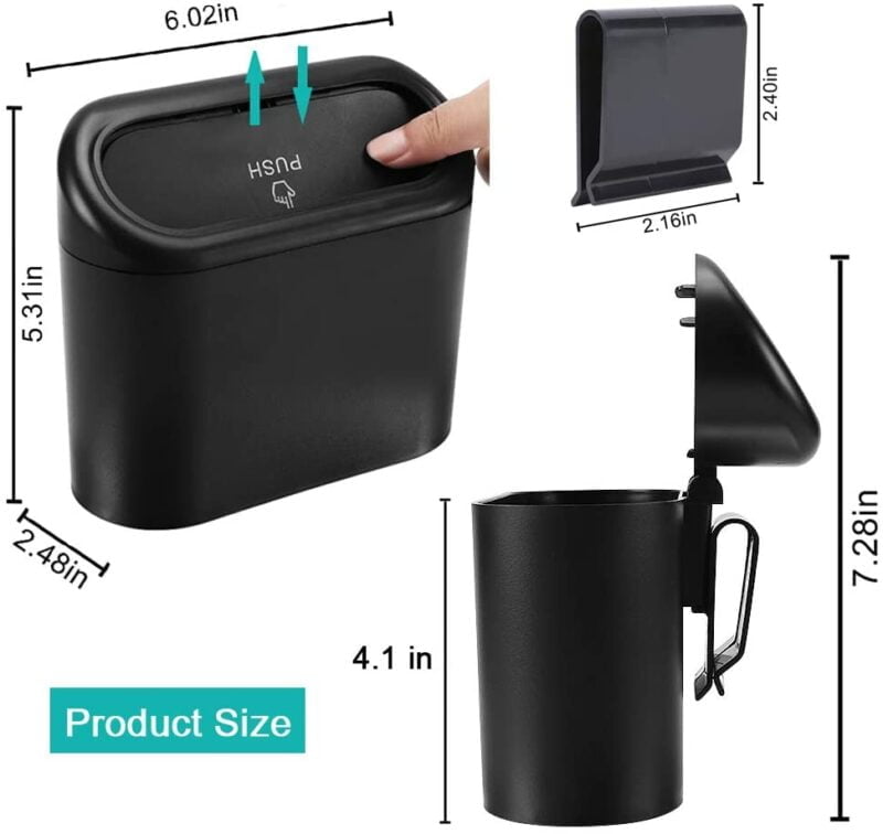 - Compact Appearance: Size: 6.1 x 5.5 x 2.6 inch, It’s a tiny but convenient and functional car garbage can, small trash can maintains Your Vehicle Clean and Organized, yet do not occupy the other space of the car. The car garbage can could stay organized while traveling or vacationing. It is very handy for you.