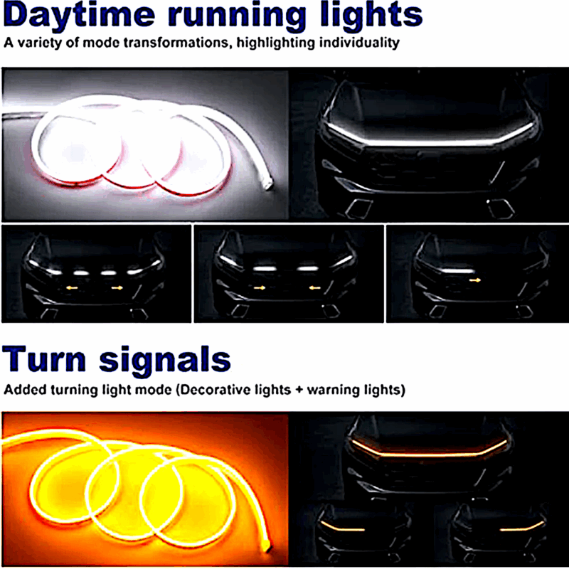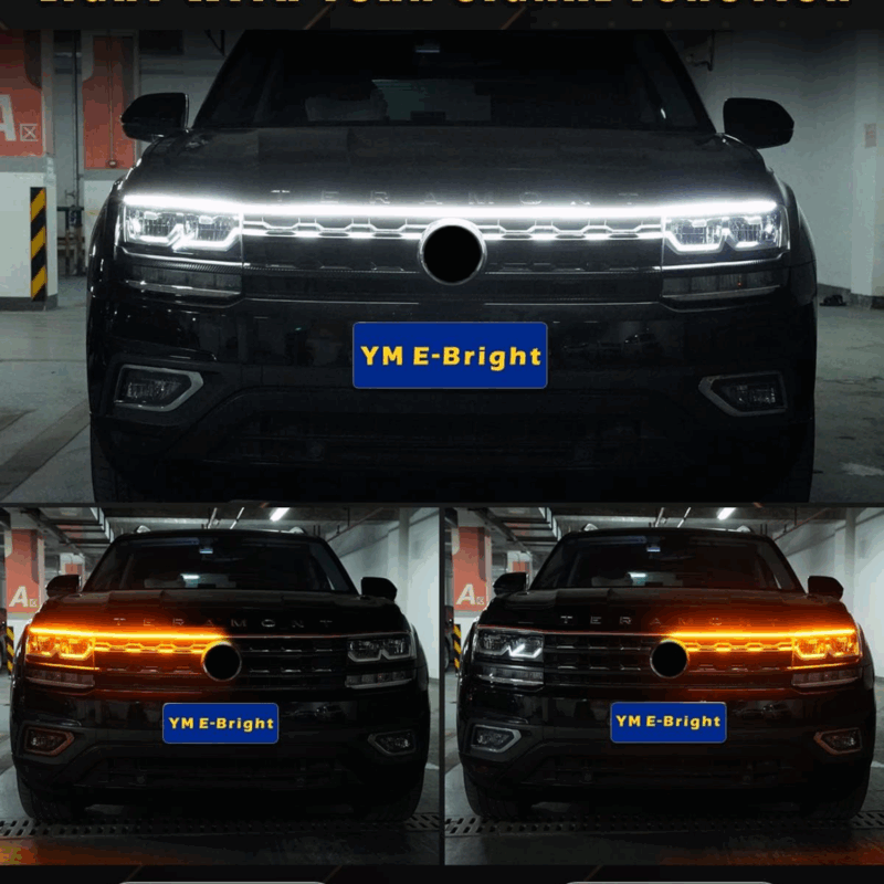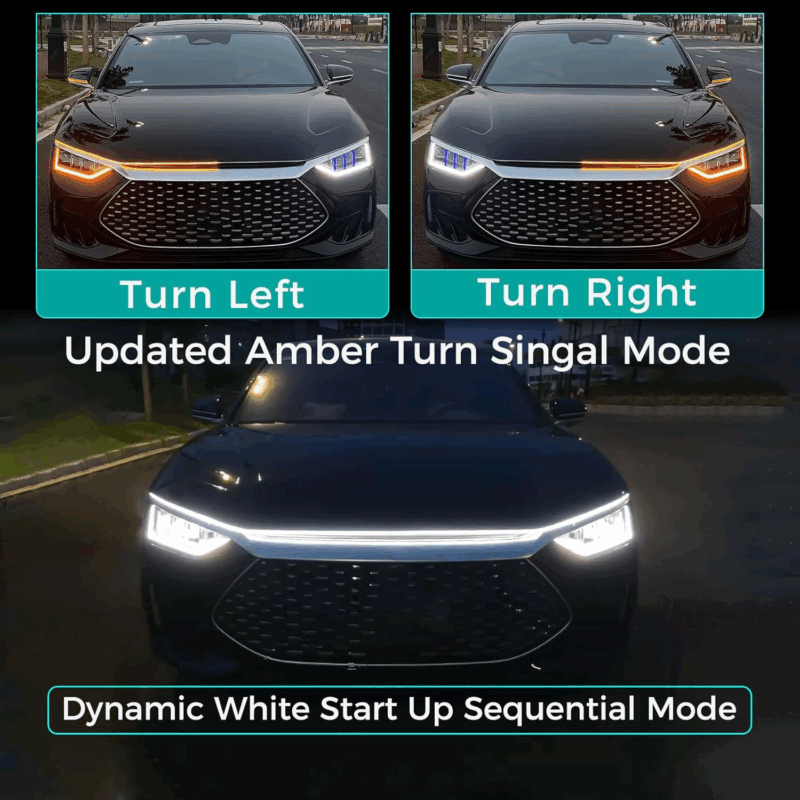 Dynamic White Amber LED Car Hood Strip Lights works automatically in dynamic scan run-through effect when starting up the car and stay on constant lighting mode when driving, makes your car outstanding and drive safely at darkness, remind oncoming vehicles or pedestrians, and reduce the incidence of traffic accidents. Most importantly, This Dynamic Scan Start Up Hood beam Kit is waterproof IP68,bentable,cuttable by the black mark on the light.